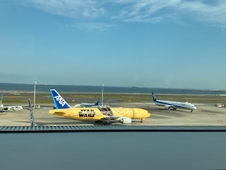 一回目は自宅から着けて行った排尿バッグがコーヒーを飲んだせいか意外と貯まっていたので、フライトの前に捨てておこうと娘と一緒にトイレに行きました。奥の一つだけ車椅子が入れるようになっていましたが、他の人も入れるので列に並んでいました。