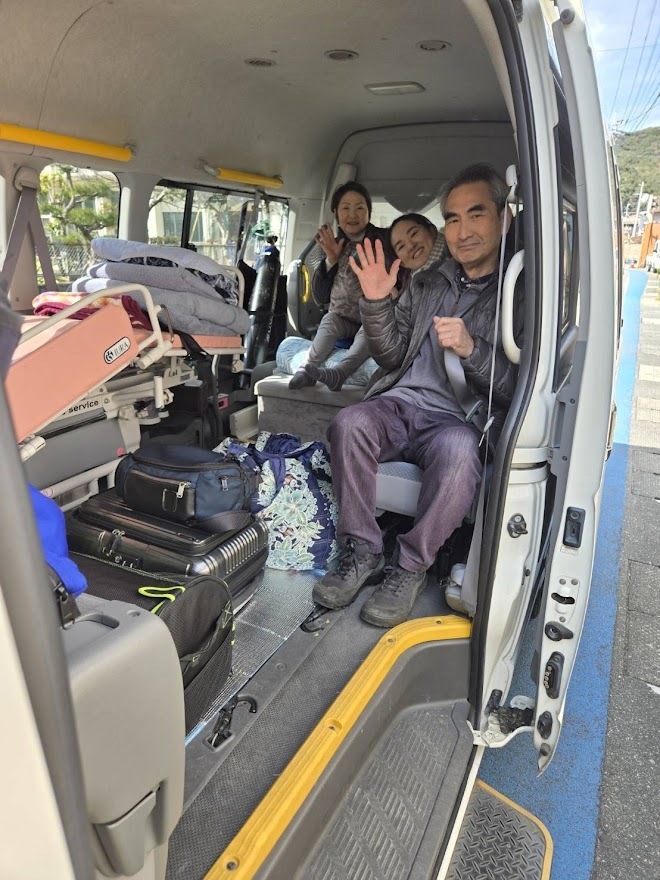 走行距離は290㎞で高速道路ですから4時間位で到着しましたが、発症後24日目はまだストレッチャーでの移動でした。転院先の紹介で長野県飯田市まで迎えに来てもらった介護タクシーの費用は11万円強だったと思います。