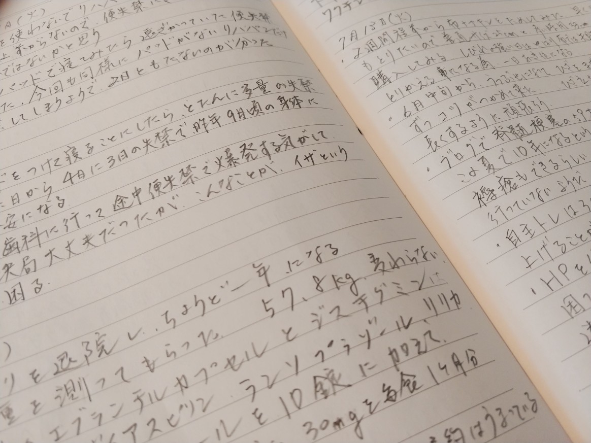 自己管理するためのノートを発症時翌日から書いています。医師や看護師からの説明や、その時々の処方箋、体調などを書いておくと、変化が分かり励みになると思います。
